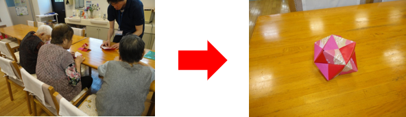 当デイサービスの最大の特徴は、折り紙を使った作品作りです。写真のように職員が丁寧に教えますので、初めての方でも安心してご参加いただけます。完成した物は御自宅にお持ち帰りいただいていますのでご自宅の部屋に飾ったり、お孫さんにプレゼントしたりする方が多いです。他にも下の写真のような季節の飾りも作ります。