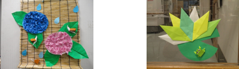 6月に作った「梅雨」をイメージした施設内に飾るものです。毎月飾りを変えて季節感を味わってもらえるようにしています。